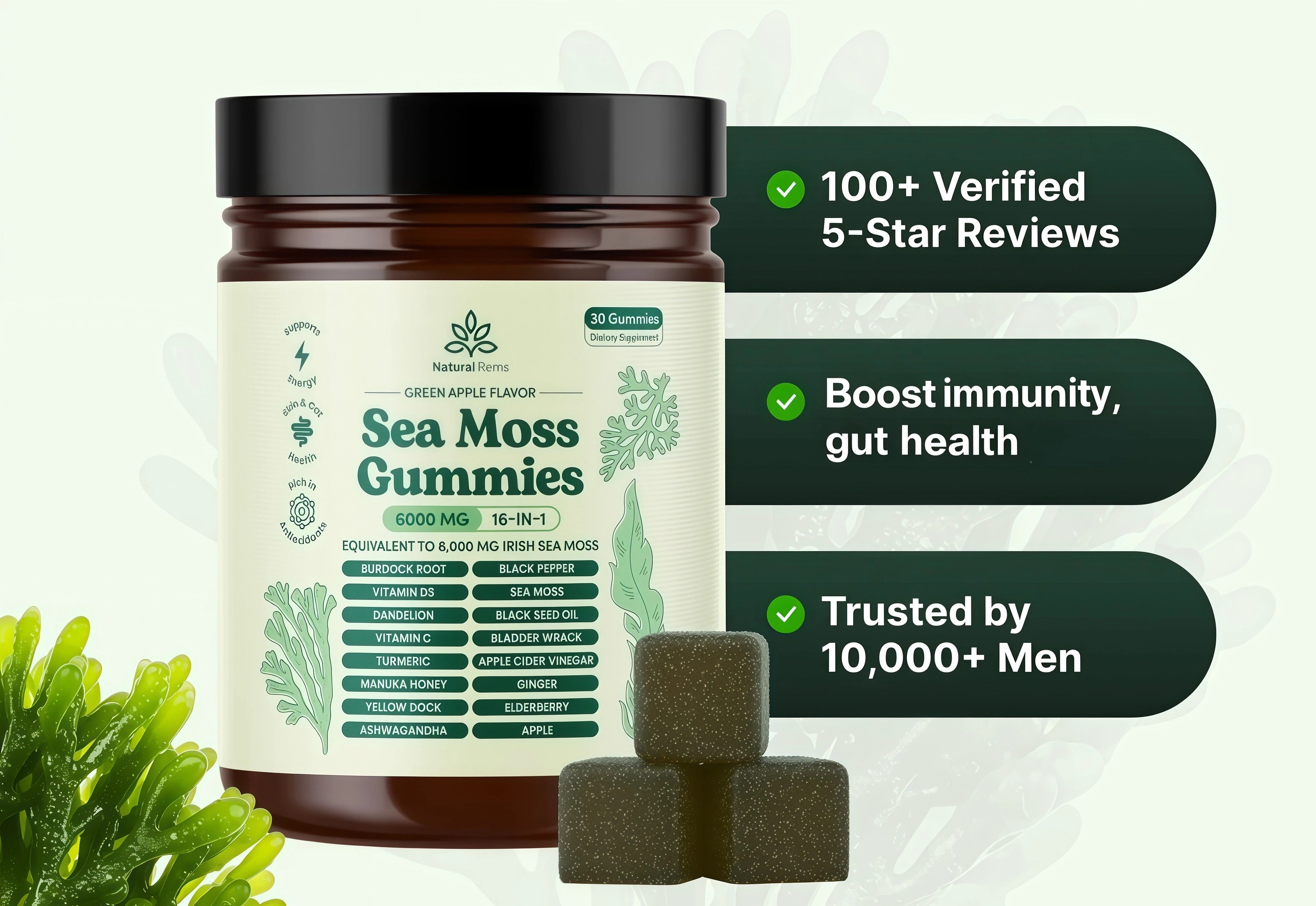 Most sea moss products only deliver one ingredient. Natural Rems combines raw sea moss with 15 additional proven ingredients,like black seed oil, ashwagandha, zinc, and vitamin D3, into a 16-in-1 formula specifically designed for men’s energy, testosterone, and total vitality.